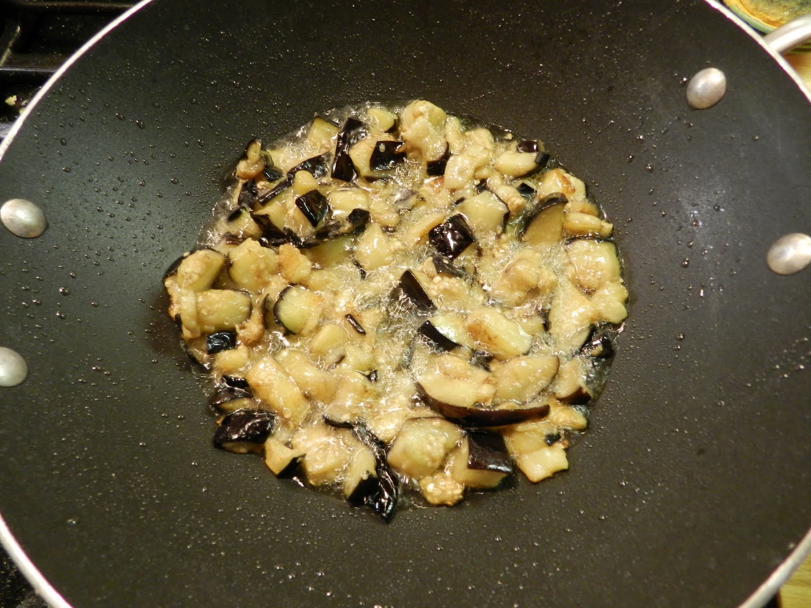 Dice an eggplant (the garlic, ginger and green onions can be chopped while the eggplant is frying)